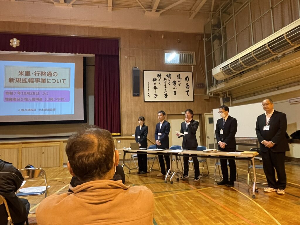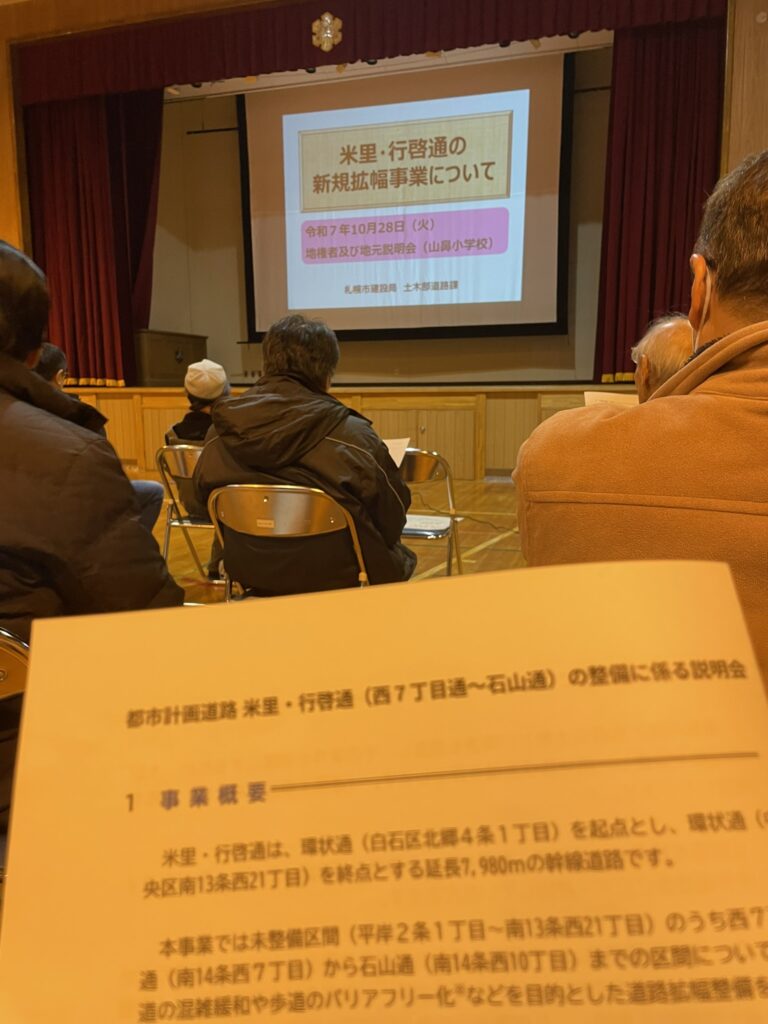 行啓通の道路拡幅についての住民説明会が10月28日(火)18時半から山鼻小学校で開催されました。