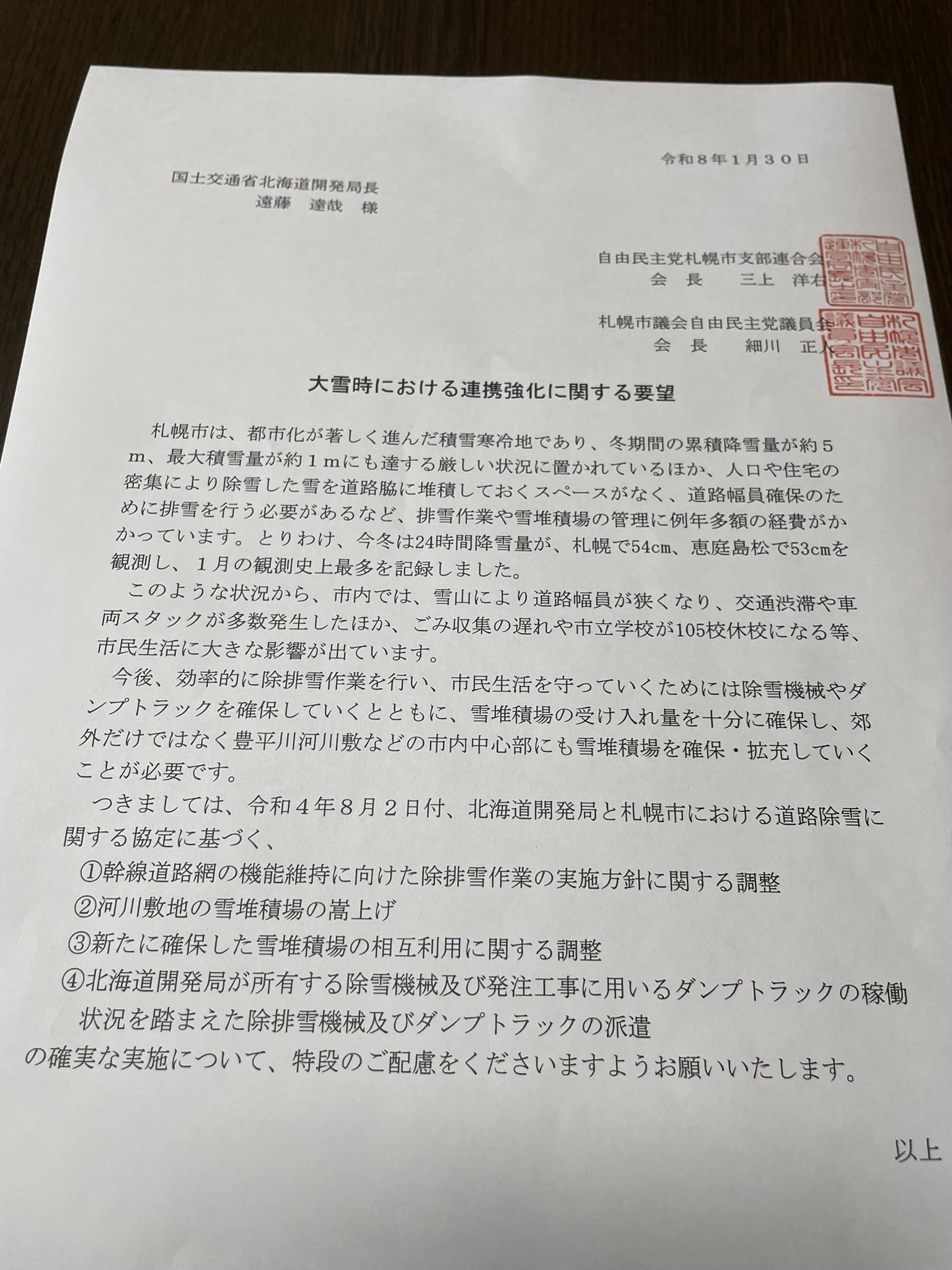 大雪対策を北海道開発局に緊急要請
